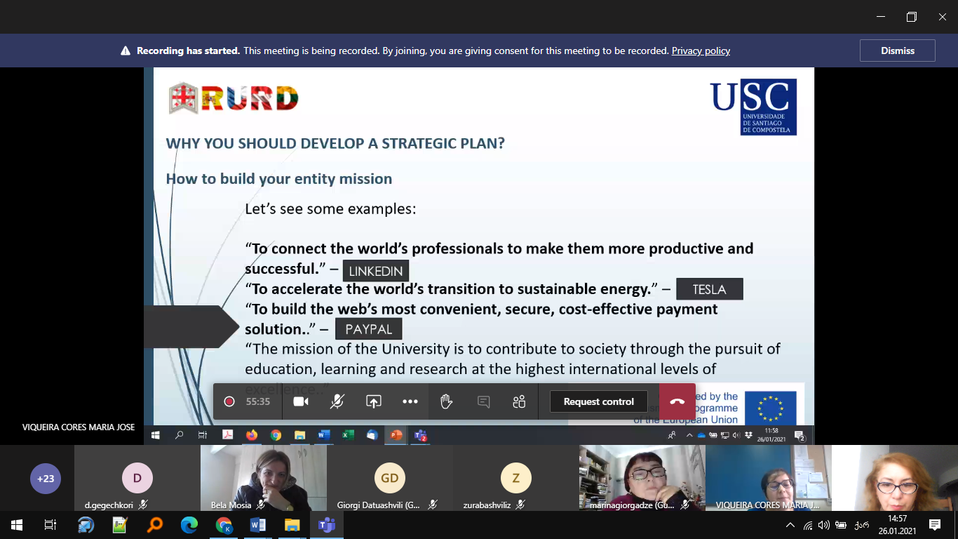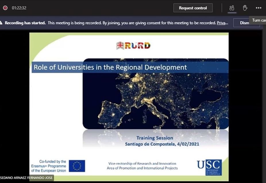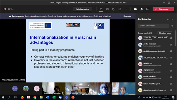 On 25-27 January and 4 February the first online training “Strategic Plan and International Cooperation Strategy” was held for the consortium member universities in the frame of the “Erasmus+” Institutional Development Project “Role of Universities in Regional Development (RURD)”. The event was held through the TEAM platform and was led by the Santiago de Compostela University researchers and professors. The participants of the four day meeting were introduced to the EU experience of the local and regional needs’ analysis, the university mission, vision, strategic plan development and SWOT analysis. Particular attention was also paid to the strategies of development of effective international cooperation, interaction between the university and the business and the European possibilities needed for the collaboration in research.