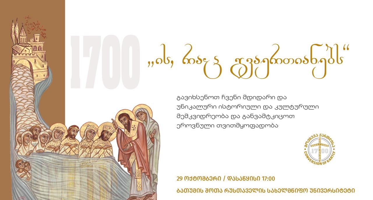 29 ოქტომბერს, 17:00 საათზე, ბათუმის შოთა რუსთაველის სახელმწიფო უნივერსიტეტის სააქტო დარბაზში გაიმართება ღონისძიება ქართლის მოქცევის 1700 წლისთავისადმი მიძღვნილი საღამოებისა და შეხვედრების ციკლის „ის, რაც გვაერთიანებს“ ფარგლებში. საღამო ეძღვნება ქრისტიანობის სახელმწიფო რელიგიად გამოცხადების 1700 წლის იუბილეს.