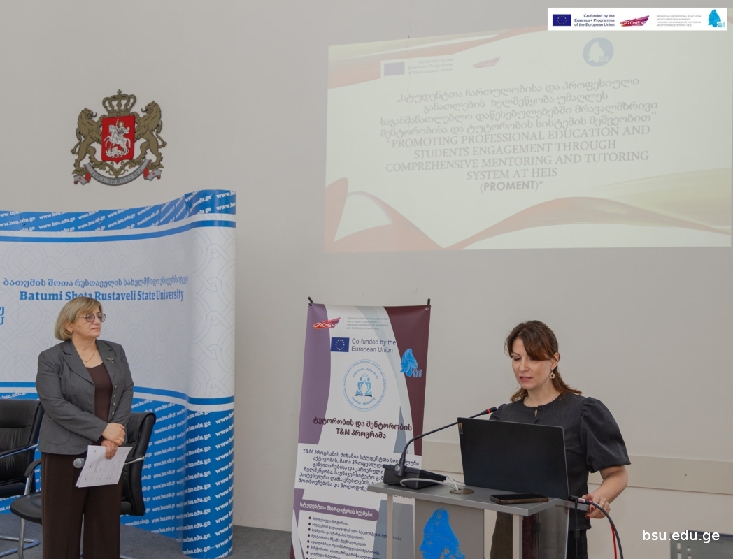 On 19–20 February, the Final Conference of the Erasmus+ grant project “Promoting professional education and students’ engagement through comprehensive mentoring and tutoring system at HEIs (Proment)” was held at Batumi Shota Rustaveli State University. The aim of the conference was to present the results of the PROMENT project to the wider public, to discuss the prospects for further development and sustainability of the tutoring and mentoring programme implemented at BSU within the framework of the project, and to share the experience gained with higher education institutions operating in the Autonomous Republic of Adjara.